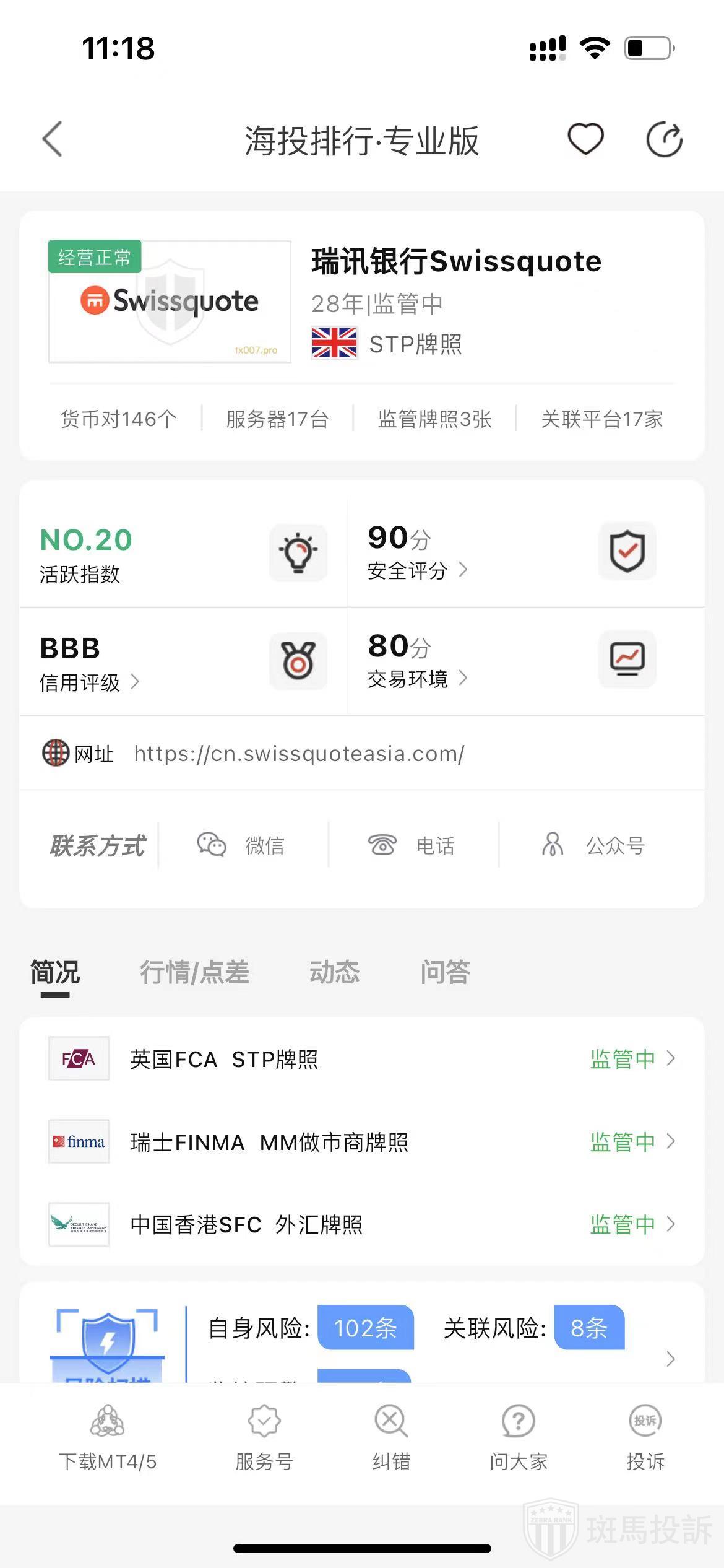 根据海投排行查询显示,这家平台叫瑞讯银行Swissquote,成立于1997年,全球排名16名,安全评分90分,平台宣传称拥有英国FCA STP牌照,瑞士FINMA MM市商牌照和中国香港SFC外汇牌照等多个国家的监管牌照,风险扫描预警有220条.