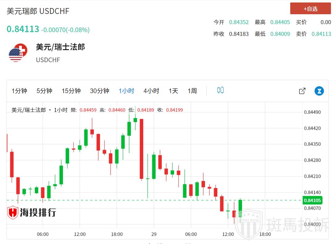 周四欧洲时段早盘,美元/瑞郎扩大跌势至0.8405附近