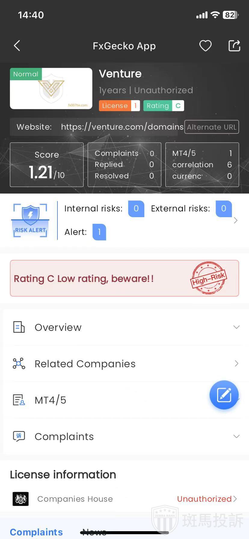 Venture,FxGecko评分1.21分,信用评级较低,建议投资者远离!