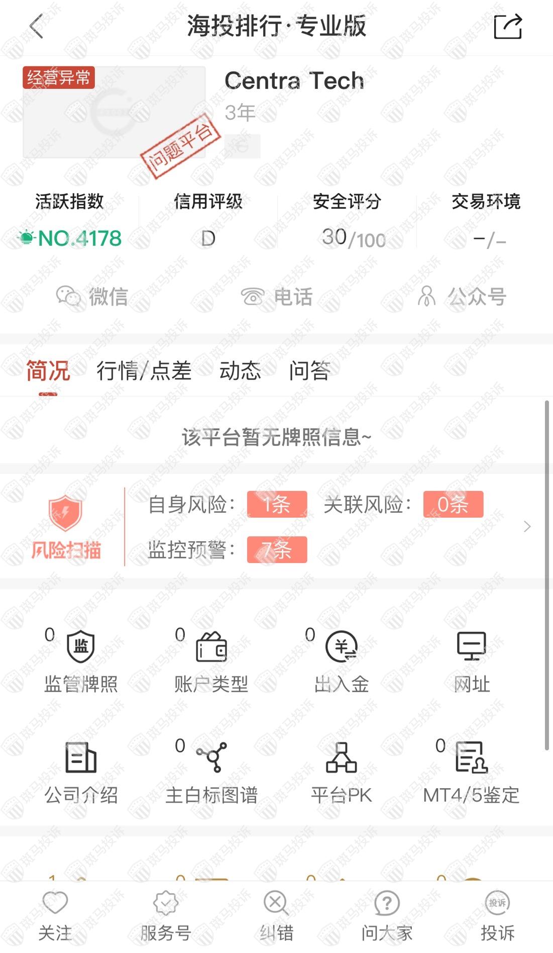 这家平台叫Centra Tech,成立于2018年,全球排名4178名,目前无监管,没有外汇牌照,不能做外汇保证金交易,风险扫描显示8条风险,投资者资金安全无保障。