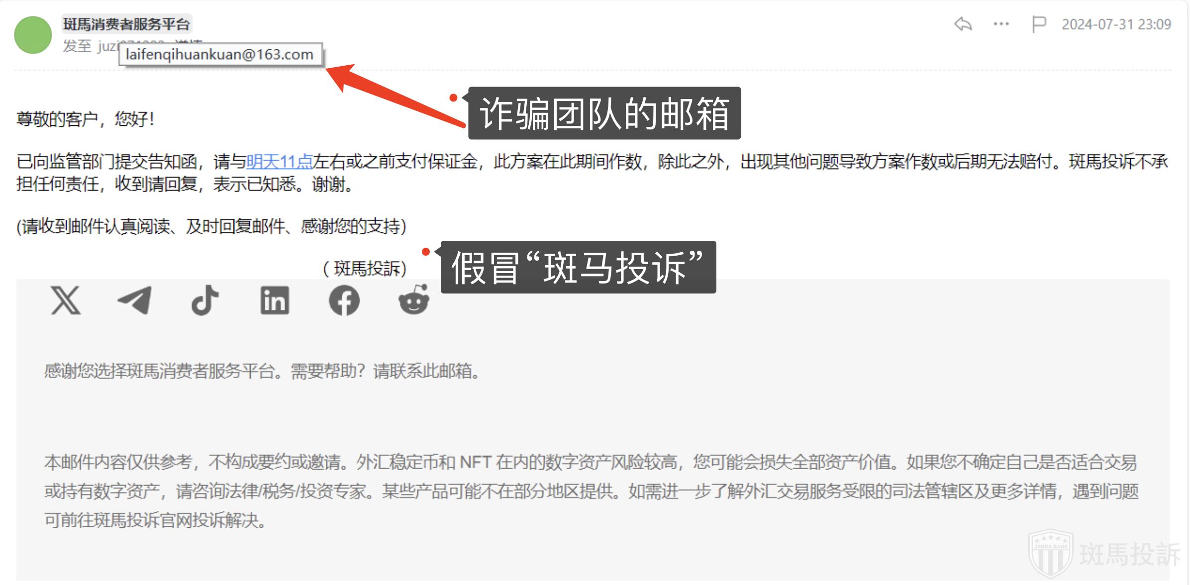 与假冒CySEC类似,一些诈骗团队也开始假冒知名的维权平台“斑马投诉”进行诈骗。这些团队通过邮箱、电话、短信以及社交平台等渠道,冒充斑马投诉的官方工作人员或企业客服,联系投资者并拉入虚假的“维权群聊”。在群聊中,诈骗分子以“已与监管机构协商赔偿”、“交钱即可优先处理”或“有特殊渠道可帮忙办理退费”等话术,诱导用户扫描二维码进入所谓的“斑马投诉理赔中心”,并要求用户填写包括银行卡、身份证在内的个人敏感信息,最终实施诈骗。警惕该诈骗团队邮箱:laifenqihuankuan@163.com。