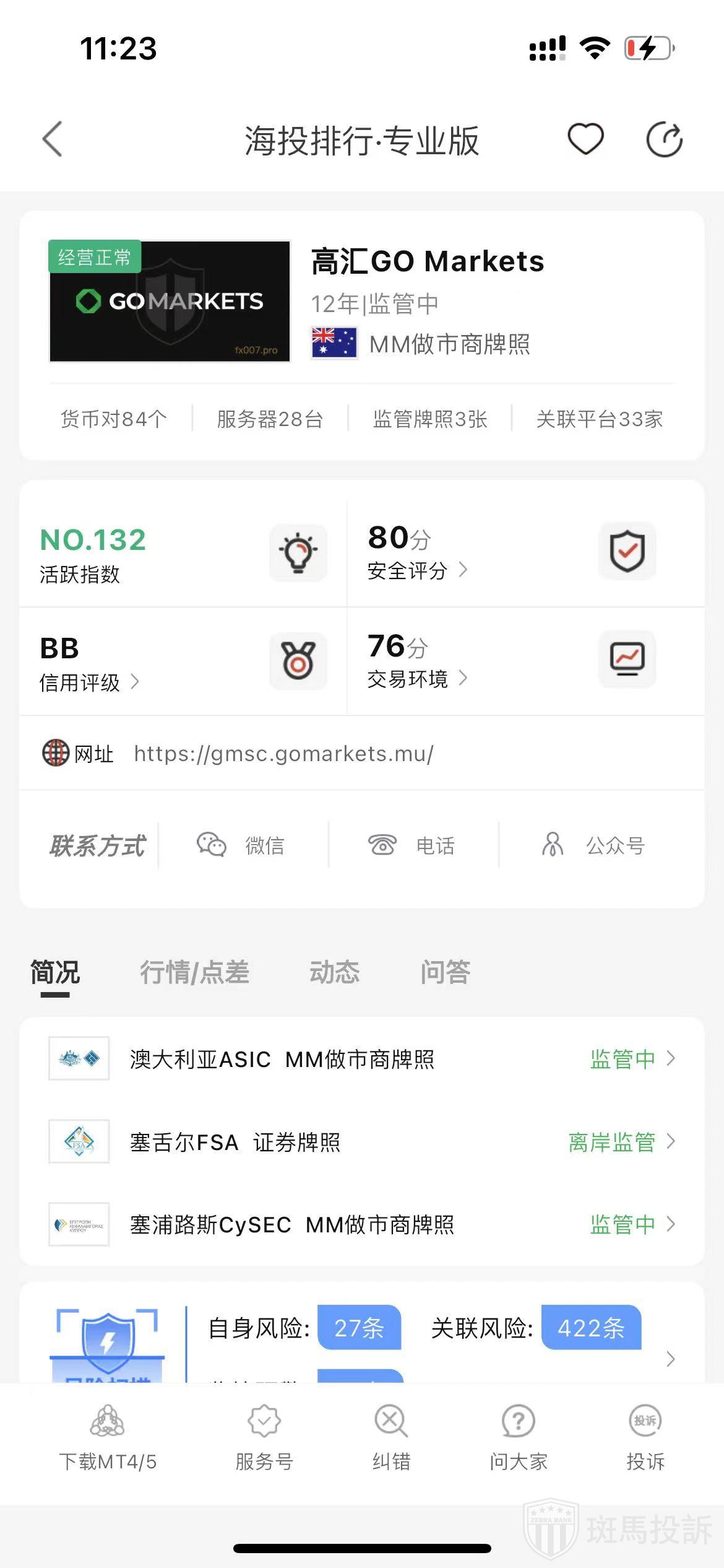 根据海投排行查询显示,这家平台叫高汇GO Markets,成立于2012年,全球排名132名,安全评分80分,平台宣传称拥有澳大利亚ASIC塞舌尔FSA和塞浦路斯CySEC等多个国家的监管牌照,风险扫描预警有480条.