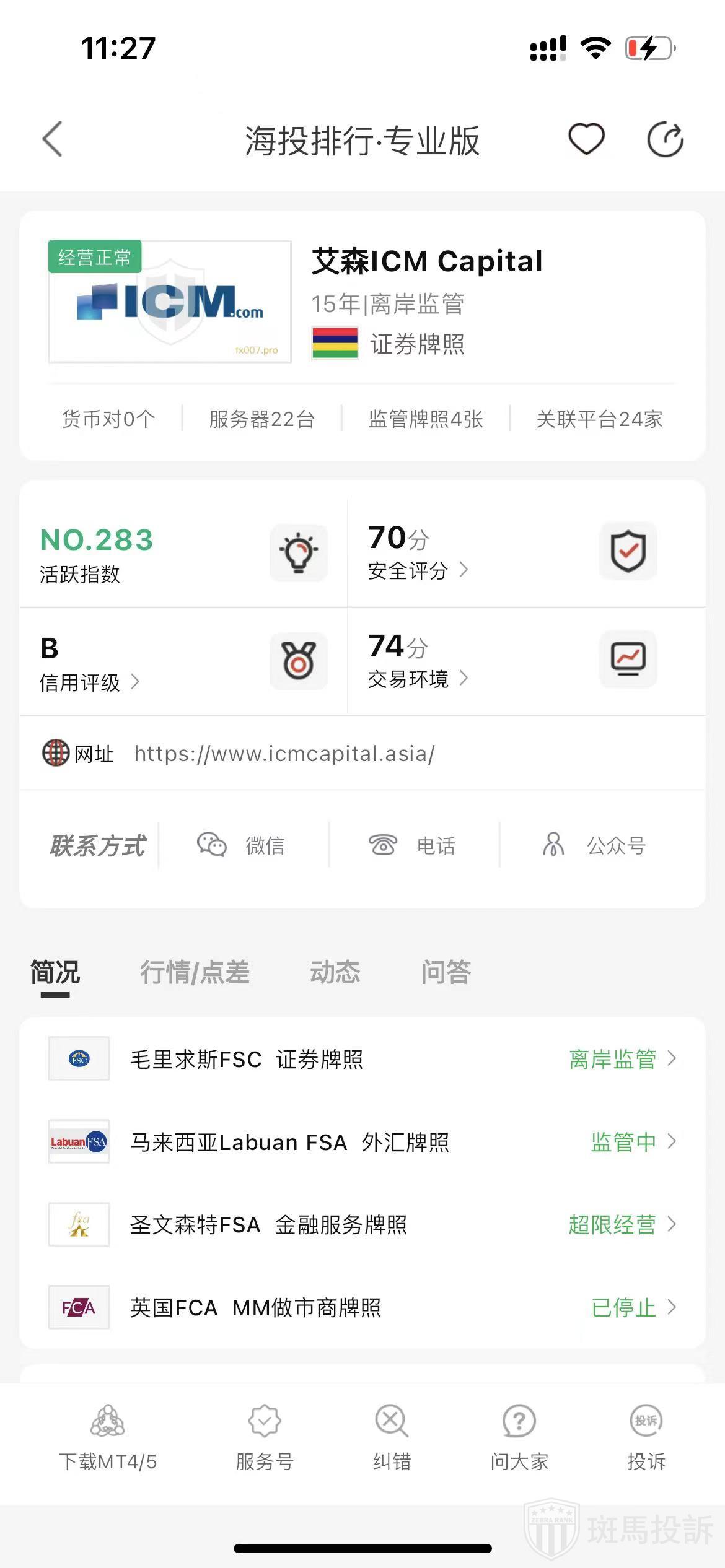 根据海投排行查询显示,这家平台叫艾森ICM Capital,成立于2009年,全球排名284名,安全评分770分,平台宣传称拥有英国FCA、圣文森特FSA、马来西亚Labuan FSA和毛里求斯FSC等多个国家的监管牌照,风险扫描预警有527条.