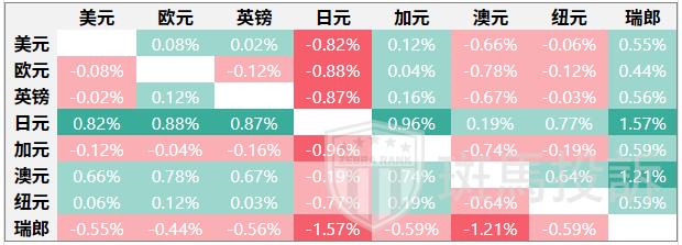 下表显示了美元(USD)对所列主要货币本周的变动百分比。美元兑日元最弱。