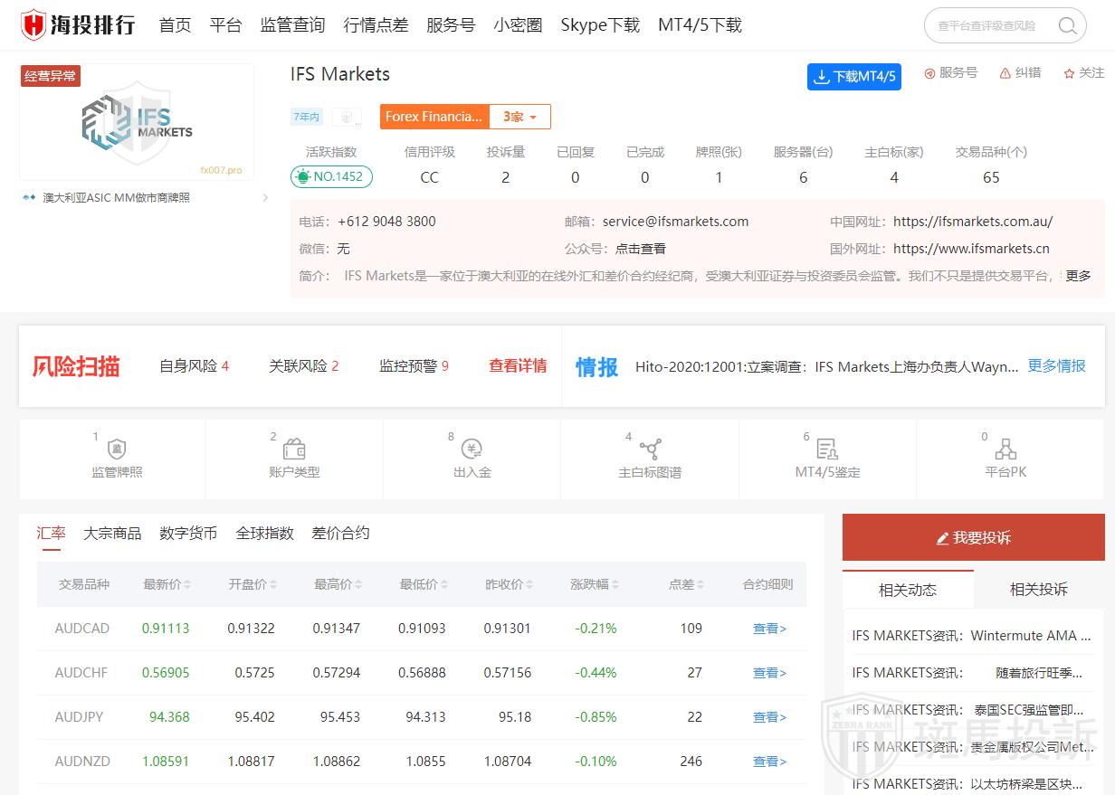 IFS Markets是一家在线外汇交易商,成立于2008年,总部位于澳大利亚悉尼。它拥有澳大利亚证券及交易委员会(ASIC)的全牌照,监管证号为323193。IFS Markets为投资者提供全球金融市场上主流及热门的交易工具,包括外汇、指数、商品等。尽管根据天网查显示,该平台已经停止在国内运营,但在其运营期间,它提供了受监管的服务,这通常意味着在合规性和资金安全方面有一定的保障。