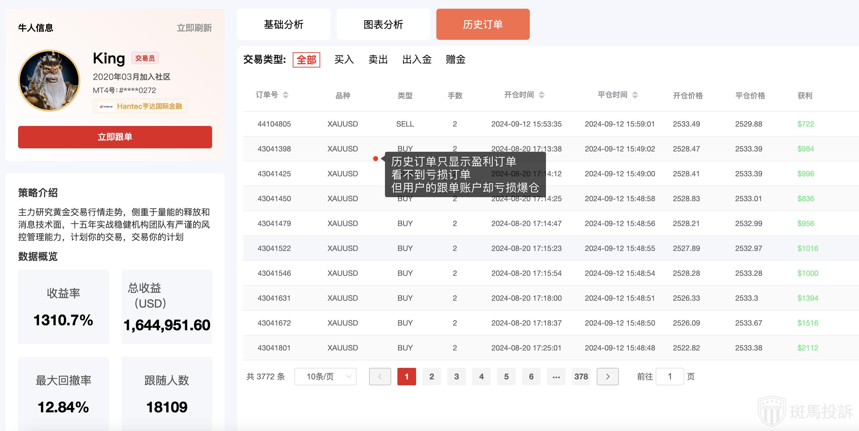 据用户反映,嘉瑞社区的信号源King存在故意开单导致跟单账户爆仓的行为,投资者因此亏损了11万美金。他指出,King的操作历史显示其自2020年3月加入嘉瑞社区,现使用的是Hantec亨达国际金融。然而,King的信号源的交易记录中仅显示盈利订单,而他的跟单账户却屡次出现亏损甚至爆仓的情况。这种反差引发了投资者的强烈不满,怀疑嘉瑞社区存在隐藏亏损订单的功能,导致用户只能看到交易员的盈利记录,忽视了背后的风险。