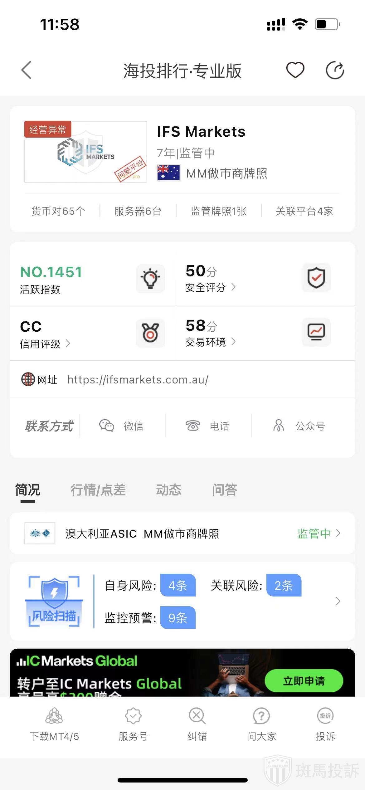 根据海投排行查询显示,这家平台叫IFS Markets,成立于2018年,全球排名1443名,安全评分50分,平台宣传称拥有澳大利亚ASIC市商牌照,风险扫描预警有15条.