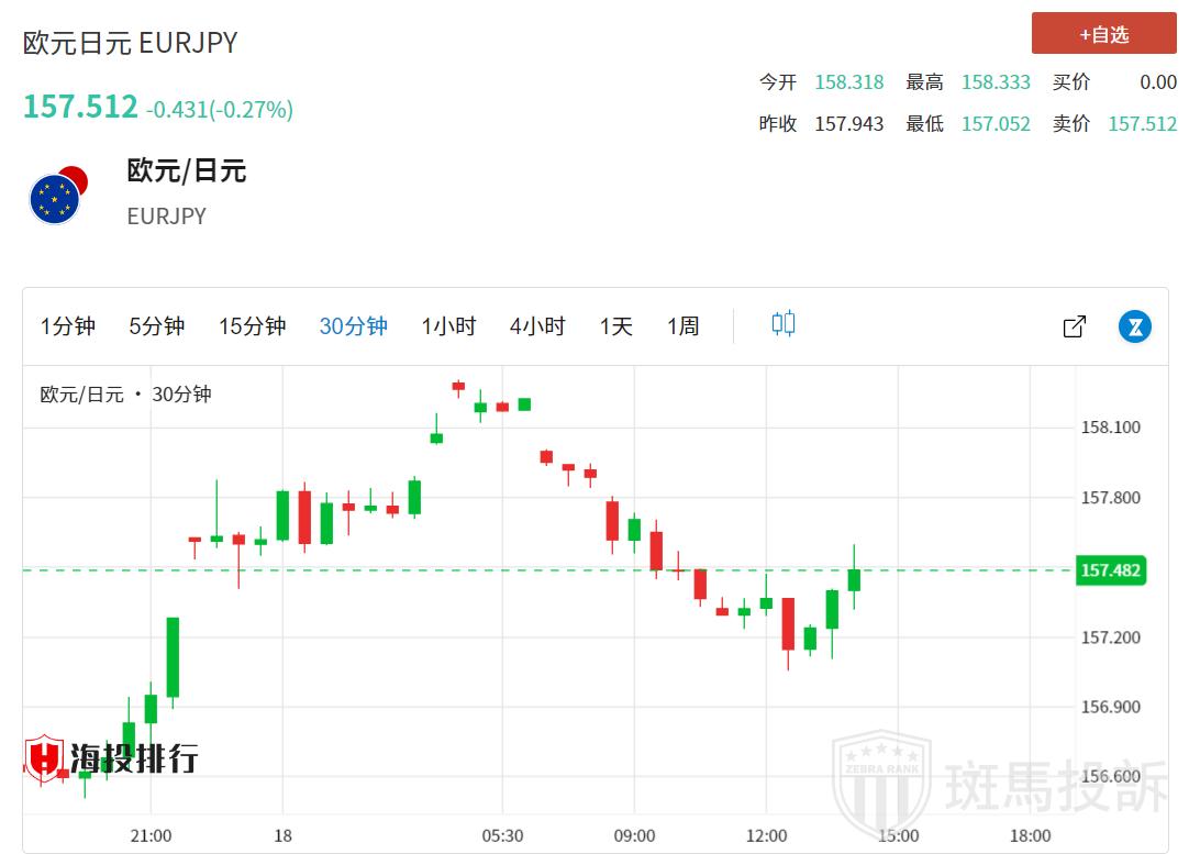 周三欧洲时段早盘,欧元/日元走低至157.20,日内跌幅为0.72%。