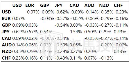 下表显示了今天澳元对列出的主要货币的百分比变化。澳元对美元是最强的。