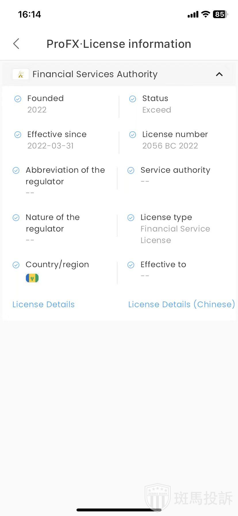 ProFX,在FxGecko APP显示4家监管信息。持有的圣文森特FSA监管状态为超限经营。投资者资金安全无保障!