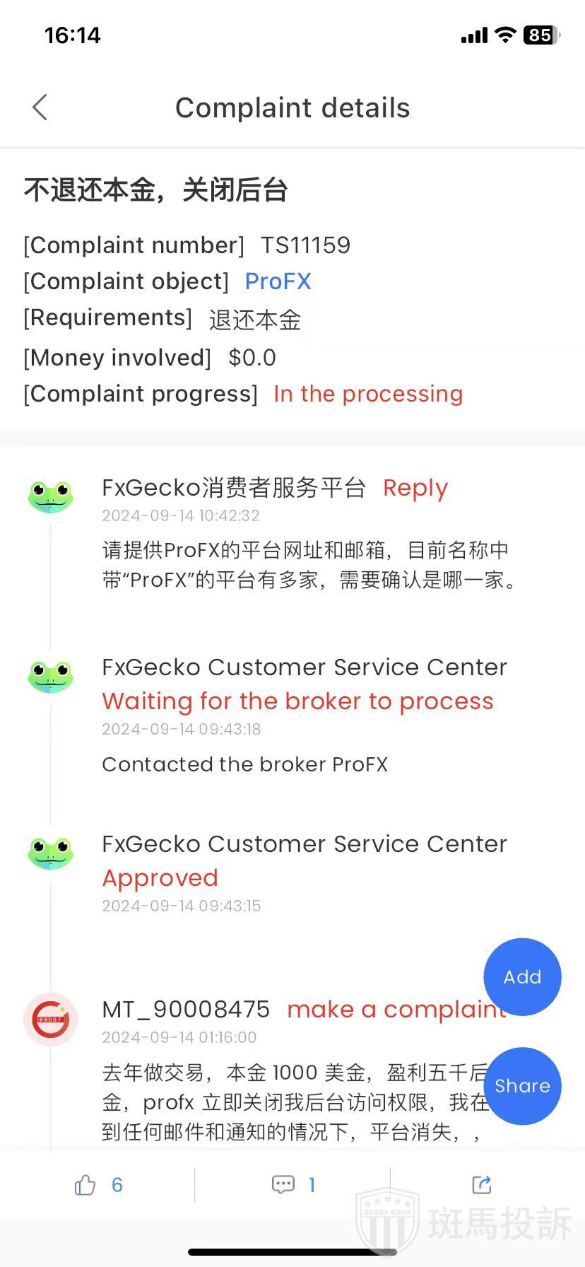 最近,有投资者通过FxGecko APP投诉ProFX不退还本金。