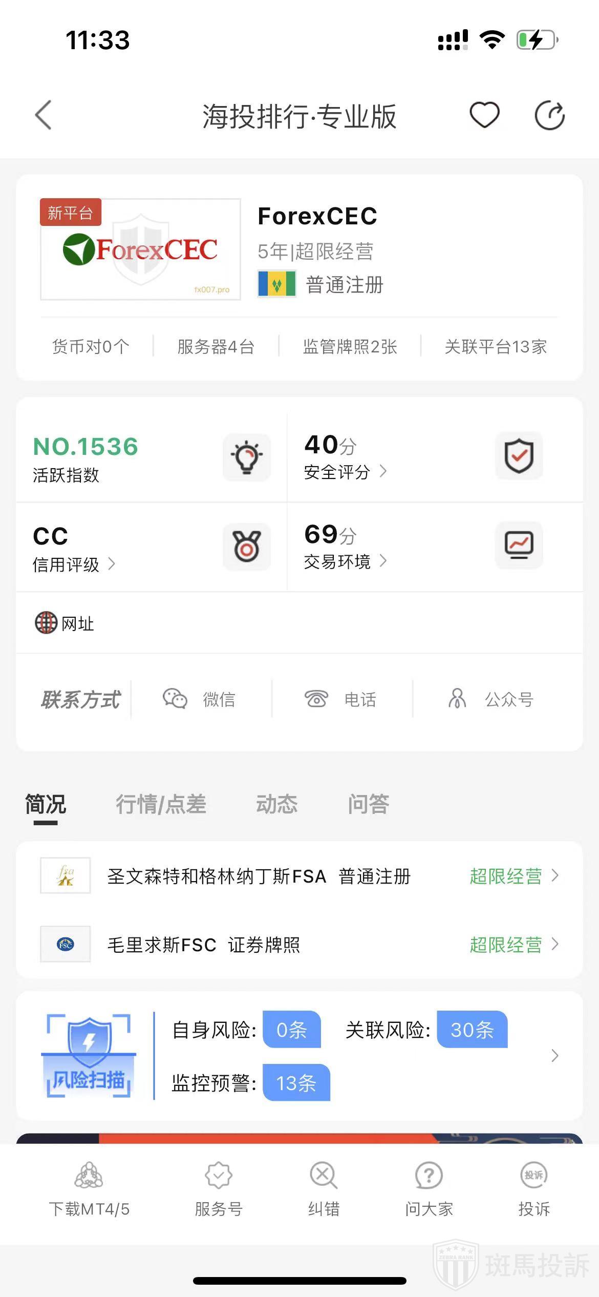 根据海投排行查询显示,这家平台叫ForexCEC,成立于2020年,全球排名1525名,安全评分44分,目前有圣文森特和格林纳丁斯FSA普通注册、毛里求斯FSC证券牌照2个监管牌照,风险扫描预警有43条.