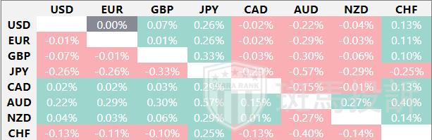 热图显示了主要货币对的波动百分比变化。基准货币从左列中选取,报价货币从顶行中选取。例如,如果投资者从左列选择欧元,然后沿水平线移动到日元,方框中显示的百分比变化即为欧元/日元波动。
