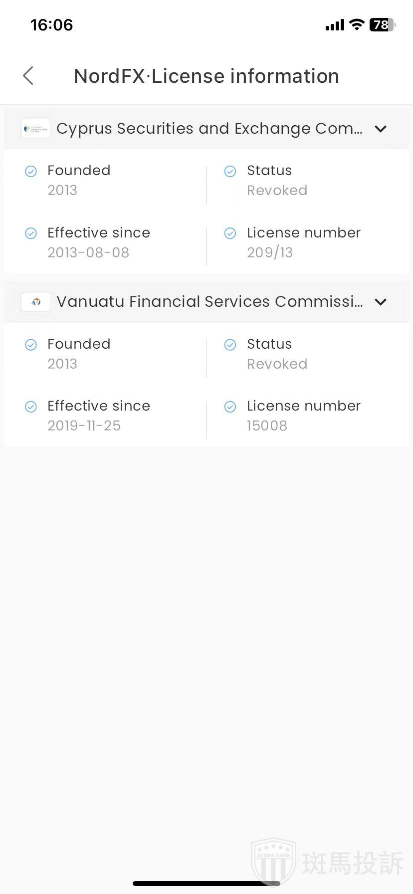 NordFX,在FxGecko APP显示2家监管平台。持有的塞浦路斯CySEC、瓦努阿图VFSC照监管状态为已撤销。投资者资金安全无保障!
