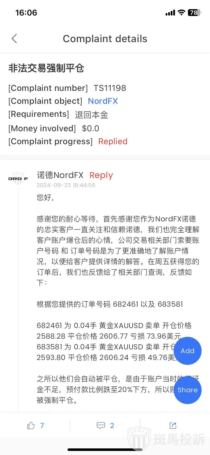 FxGecko APP接到投诉:诺德NordFX非法交易强制平仓。