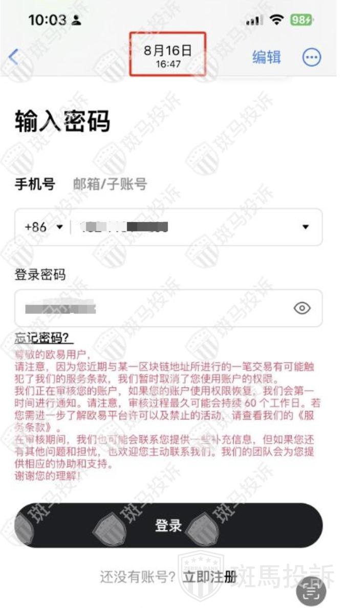 2024年8月16日,对于我来说,本应是寻常的一天。然而,当我如往常一样登录欧易OKX账户时,却意外地发现APP提示要暂停我使用账户的权限,理由是需要进行核查,而这一核查竟然需要60个工作日。我心中顿时充满了疑惑和不安,我的账户内还有急需使用的资金,这样的暂停无疑给我带来了巨大的困扰。