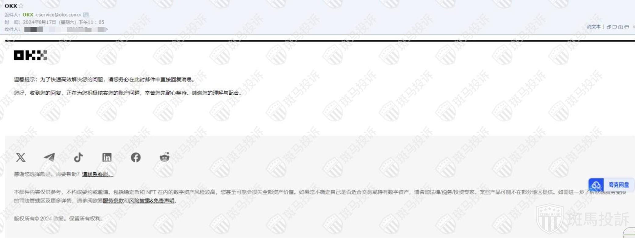在接到账户暂停使用的通知后,我立即主动联系欧易客服,希望通过邮件咨询详情。然而,让我失望的是,欧易客服的回复始终是机械般的“耐心等待”,没有任何实质性的解释和进展通报。30个工作日过去了,我依然没有得到任何处理结果,账户的登陆限制依然存在。