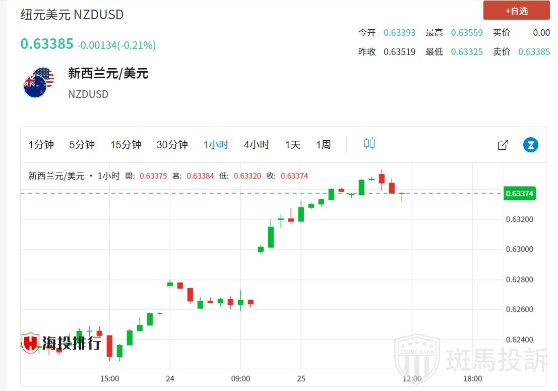 纽元/美元周三触及九个月高点0.6355。