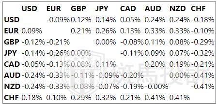 下表显示了澳元(AUD)兑主要货币今日的百分比变化。澳元兑瑞士法郎最弱。