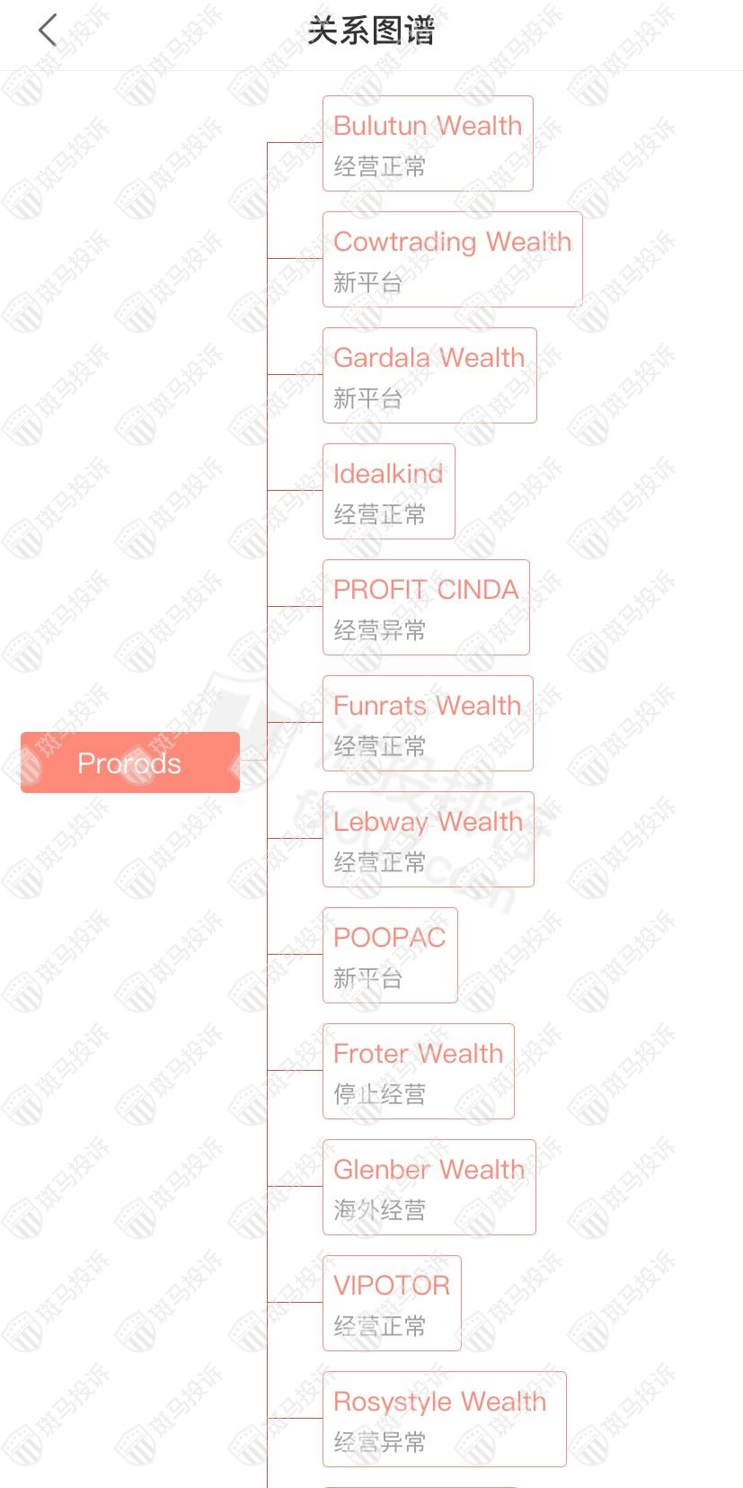 主白标关系显示,Prorods平台和16家平台是一家公司,从他们的服务器地址,网站的模板来看,都可以看出来相似的地方。其中Froter Wealth停止经营;PROFIT CINDA、Rosystyle Wealth经营异常。