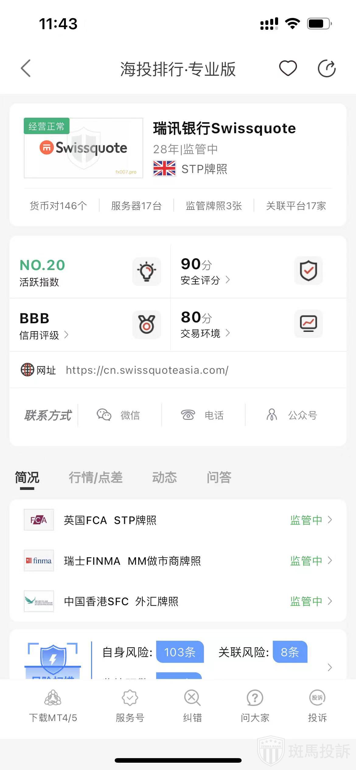 根据海投排行查询显示,这家平台叫瑞讯银行Swissquote,成立于1997年,全球排名16名,安全评分90分,平台宣传称拥有英国FCA STP牌照,瑞士FINMA MM市商牌照和中国香港SFC外汇牌照等多个国家的监管牌照,风险扫描预警有220条