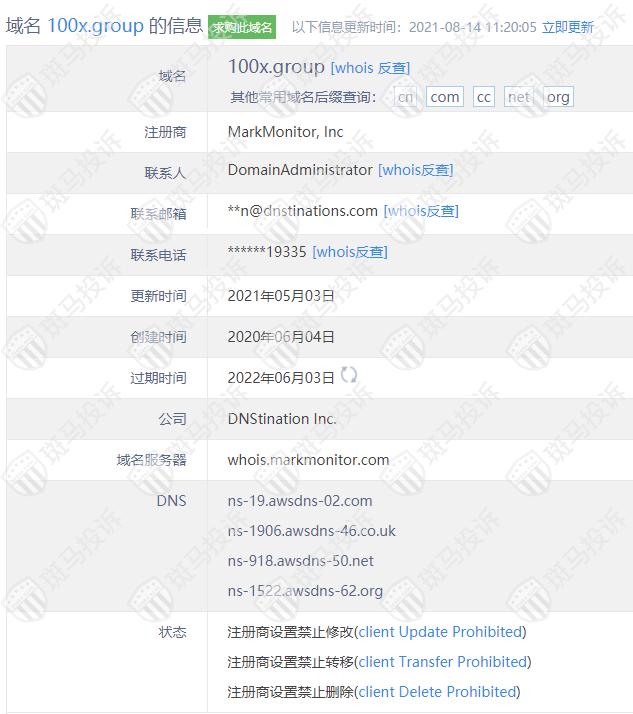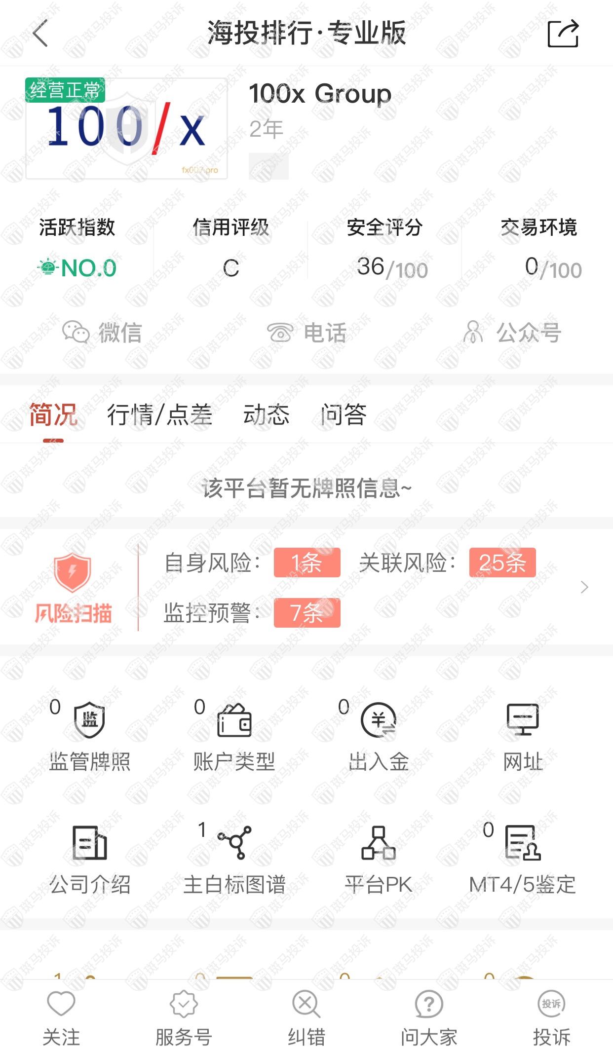 这家平台叫100x Group,成立于2020年,全球无排名,目前无监管,没有外汇牌照,不能做外汇保证金交易,风险扫描显示33条风险,投资者资金安全无保障。