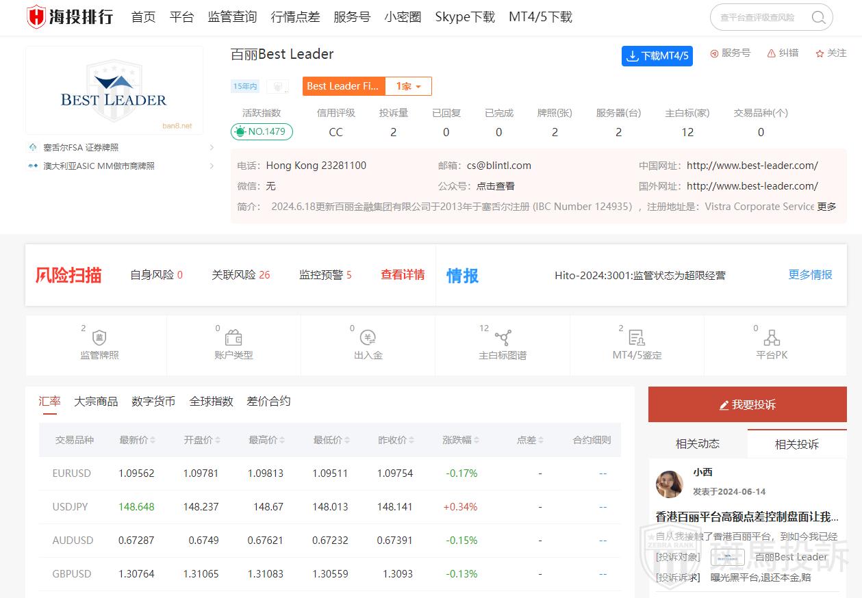 总的来说,虽然百丽外汇平台提供多种交易服务和客户支持,但其监管状态存在疑问,且有一些负面信息。因此,在决定是否使用该平台进行交易之前,建议您进行更深入的调查和考虑。在外汇交易中,选择一个信誉良好且受到严格监管的经纪商非常重要。