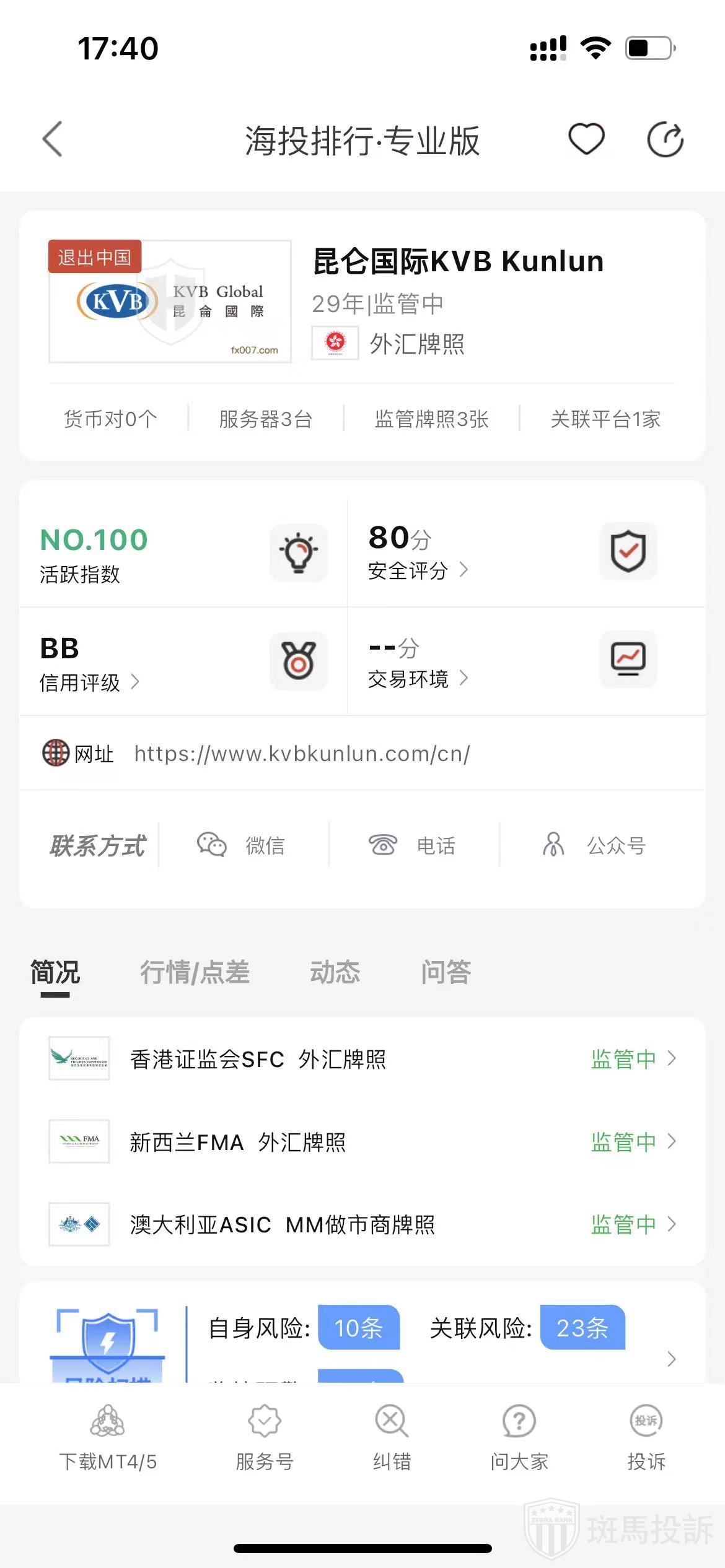 根据海投排行查询显示,这家平台叫昆仑国际KVB Kunlun,成立于1996年,全球排名101名,安全评分70分,平台宣传称目前有澳大利亚ASIC市商牌照,香港证券会SFC外汇牌照和新西兰FMA外汇牌多个国家的监管,风险扫描预警有64条。
