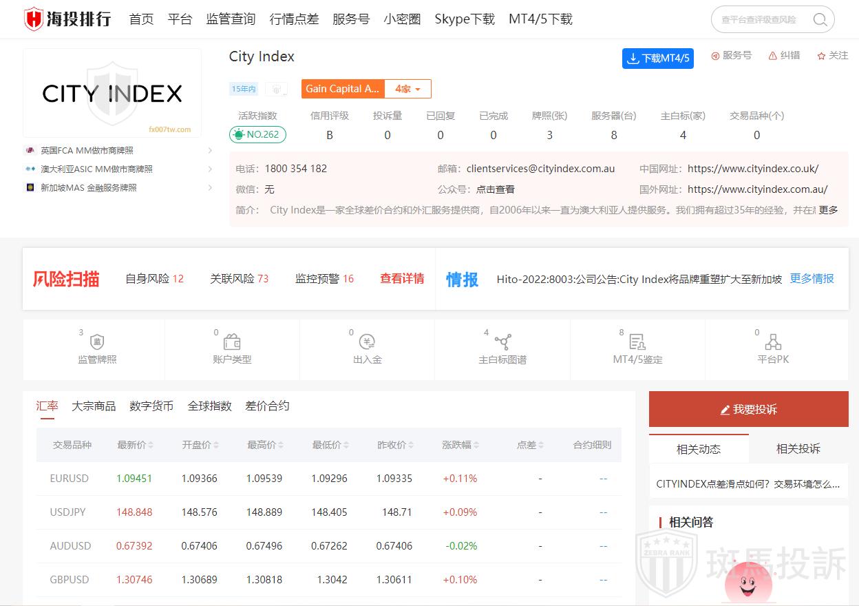 City Index是一家提供差价合约(CFD)和外汇交易服务的经纪商。它成立于1983年,为全球交易者提供超过6300种市场选择,包括外汇、指数、股票和大宗商品等。City Index是一个受多国监管的经纪商,包括ASIC、MAS和FCA,这确保了其交易服务的安全性和公平性。