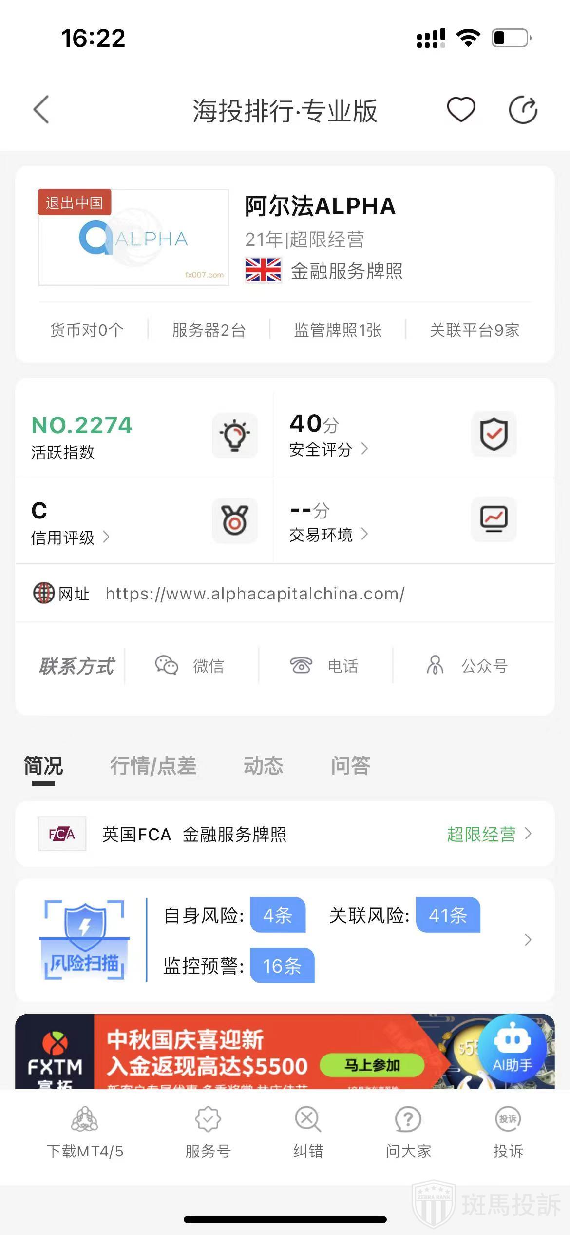 根据海投排行查询显示,这家平台叫阿尔法ALPHA,成立于2004年,全球排名2226名,安全评分40分,平台宣传称拥有1个国家的监管牌照,风险扫描预警有60条。
