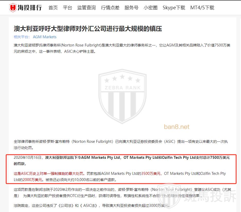 然而,AGM Markets也面临一些法律问题和监管处罚。2020年10月16日,澳大利亚联邦法院对AGM Markets Pty Ltd及其前授权代表OT Markets Pty Ltd和Ozifin Tech Pty Ltd处以7500万澳元的罚款。AGM Markets被命令支付3500万澳元,而OT Markets和Ozifin各被命令支付2000万澳元。这项处罚是因为这些公司在向澳大利亚零售投资者提供场外(OTC)衍生品时进行了系统性不当行为。