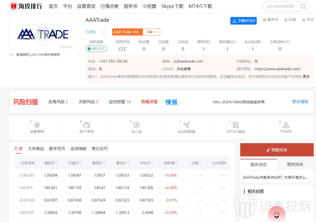 AAATrade是一家成立于2013年的总部位于塞浦路斯的外汇和CFD经纪公司。该公司受到塞浦路斯证券交易委员会(CySEC)的监管,拥有良好的监管记录。AAATrade提供多种交易产品,包括外汇、股票、指数、商品和加密货币等差价合约交易。