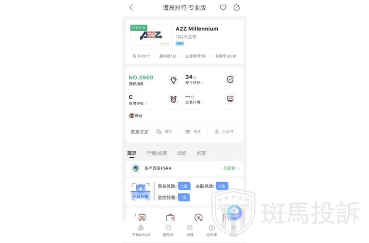 这家叫A2Z Millennium 的平台,成立于2024年,全球活跃指数3960名,目前无监管,也没有外汇牌照,不能做外汇保证金交易,风险扫描显示1条风险,投资者资金安全无保障。