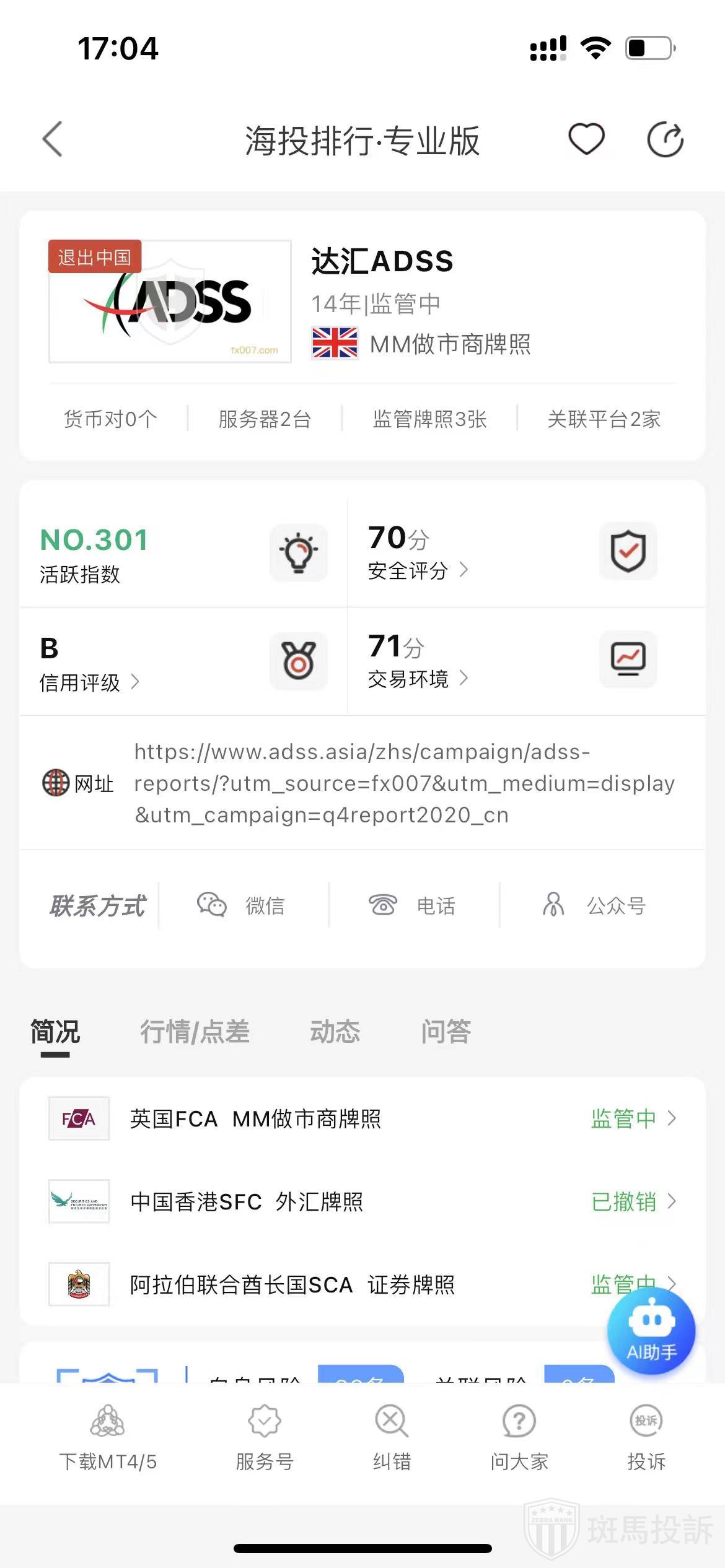 根据海投排行查询显示,这家平台叫达汇ADSS,成立于2010年,全球排名302名,安全评分70分,平台宣传称拥有英国FCA、中国香港SFC外汇牌照和阿拉伯联合酋长SCA证券牌照等多个国家的监管牌照,风险扫描预警有78条。