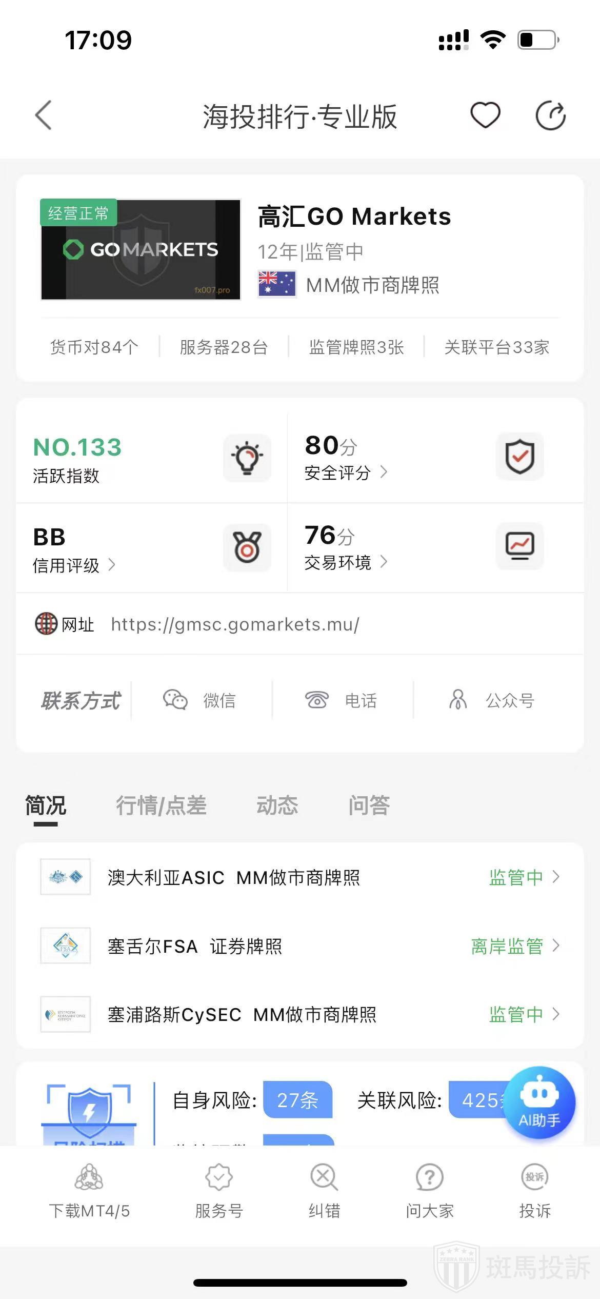 根据海投排行查询显示,这家平台叫高汇GO Markets,成立于2012年,全球排名132名,安全评分80分,平台宣传称拥有澳大利亚ASIC塞舌尔FSA和塞浦路斯CySEC等多个国家的监管牌照,风险扫描预警有480条。