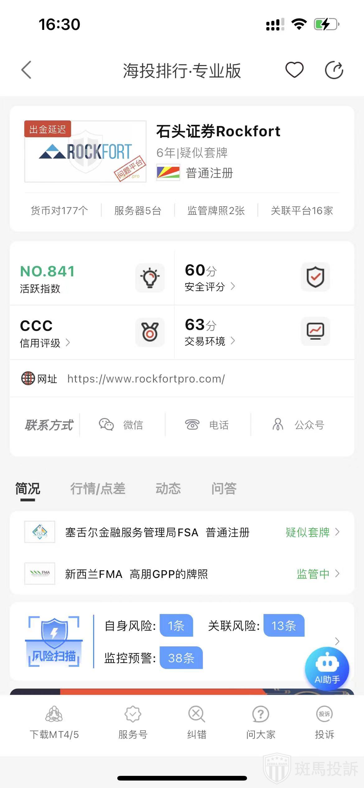 根据海投排行查询显示,这家平台叫Rockfort石头证券,成立于2019年,全球排名836名,安全评分60分,平台宣传称拥有塞舌尔金融服务牌照和新西兰FMA等多个国家的监管牌照,风险扫描预警有52条。