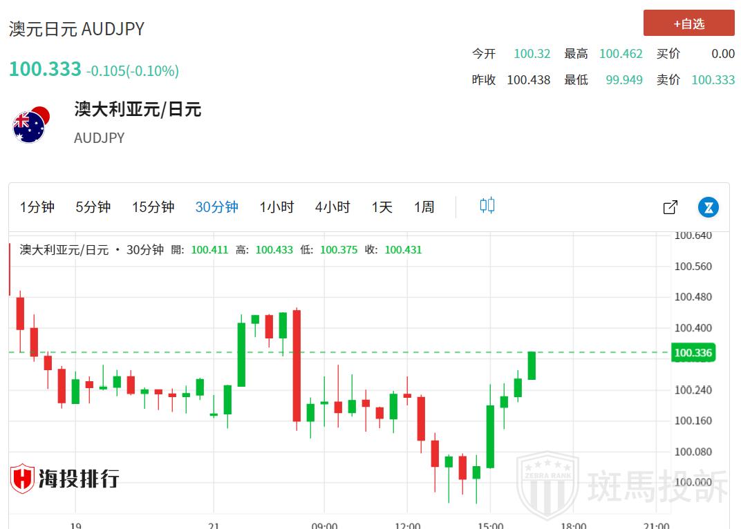 澳元/日元连续第二个交易日持续走低,周一欧洲交易时段交投于100.20附近。日本当局可能干预外汇市场支撑日元。