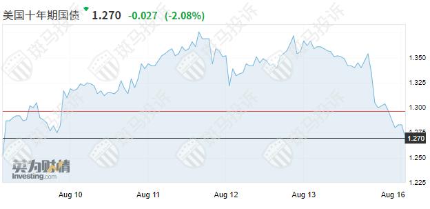 10年期美债收益率上周五尾盘下跌8.1个基点报1.283%,但这仍比8月4日触及的六个月低点1.127%高出了约16个基点。收益率曲线上备受关注的两年期和10年期美债收益率差尾盘收窄逾5个基点,报约108个基点。