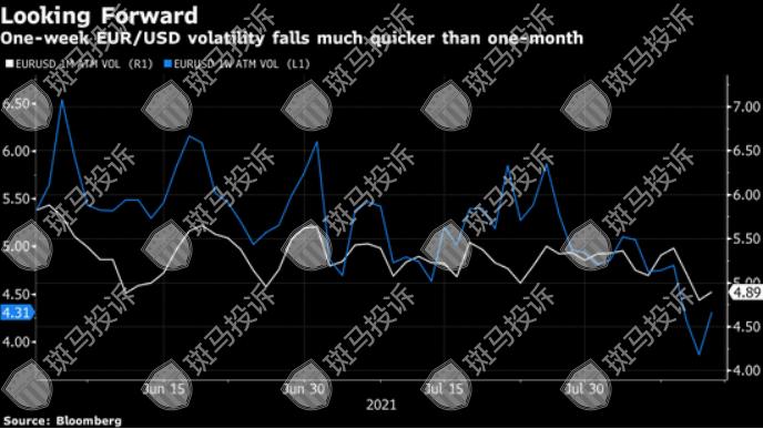 欧元/美元的1周隐含波动率上周下降近一个百分点至3.78%,为2020年2月以来的最低水平,而1个月和3个月波动率下跌不到0.5个百分点。Issa表示,两者之间的差异表明投资者可能不会太关注杰克逊霍尔会议。
