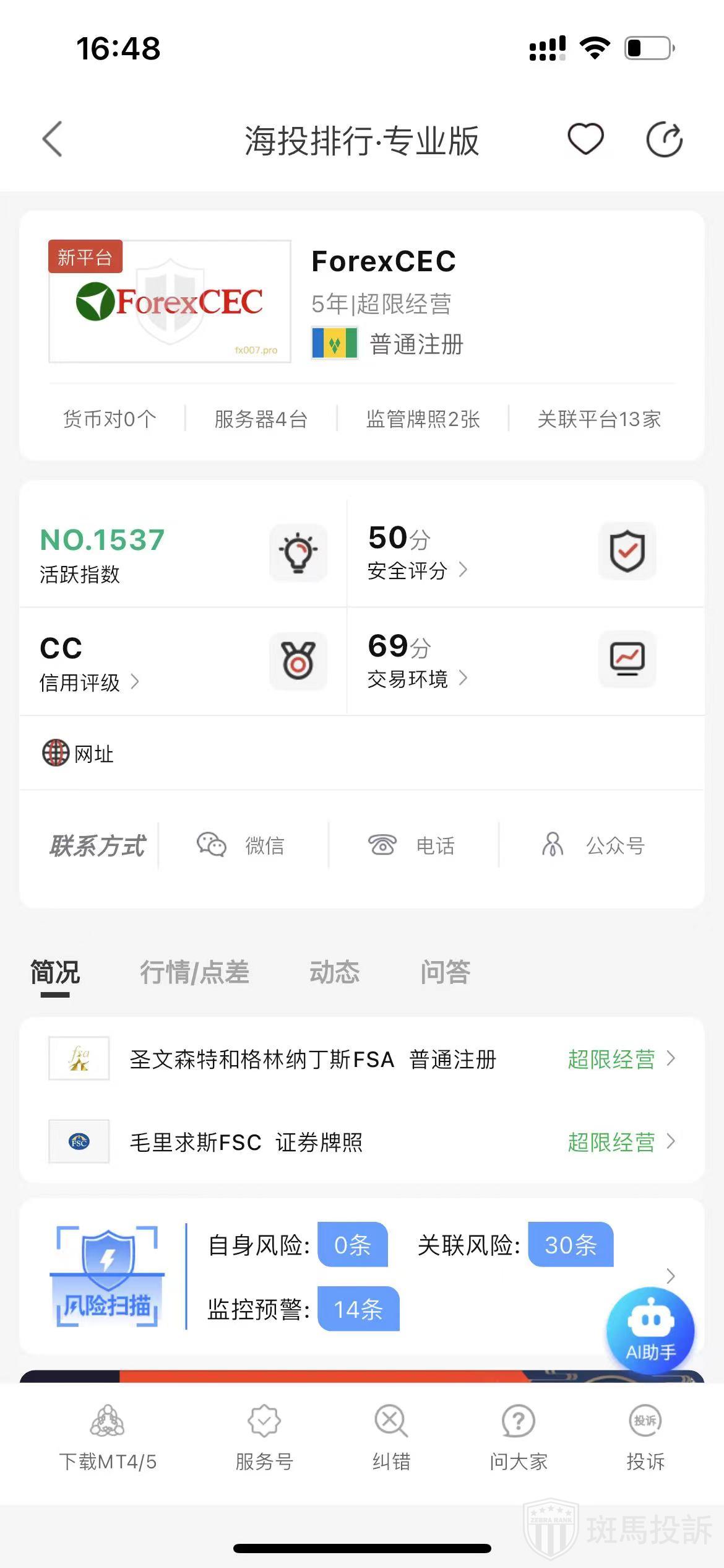 根据海投排行查询显示,这家平台叫ForexCEC,成立于2020年,全球排名1525名,安全评分44分,目前有圣文森特和格林纳丁斯FSA普通注册、毛里求斯FSC证券牌照2个监管牌照,风险扫描预警有43条。
