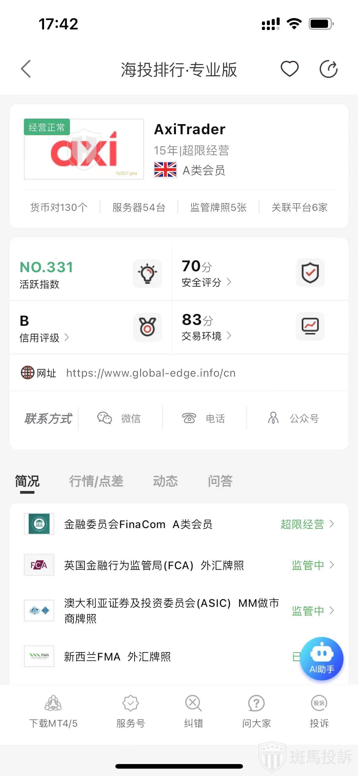 根据海投排行查询显示,这家平台叫AxiTrader,成立于2010年,全球排名331名,安全评分70分,目前平台宣传自己有5个外汇监管牌照,风险扫描133条。