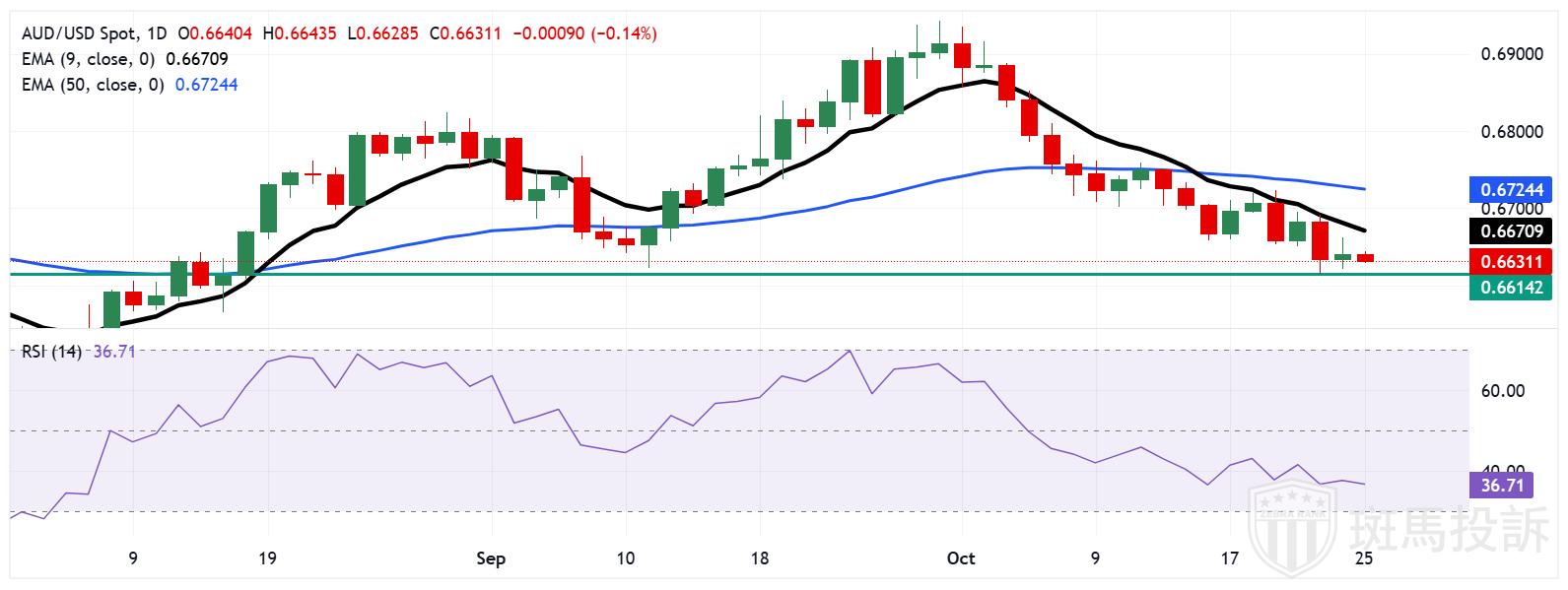 当前澳元/美元在0.6614附近触及支撑位,若跌破这一位置,可能进一步下探至心理关口0.6600。在上行方面,初步阻力位于9日指数移动均线(EMA)0.6672处,若突破该阻力,可能在50日指数移动均线0.6724遇到新的阻力。
