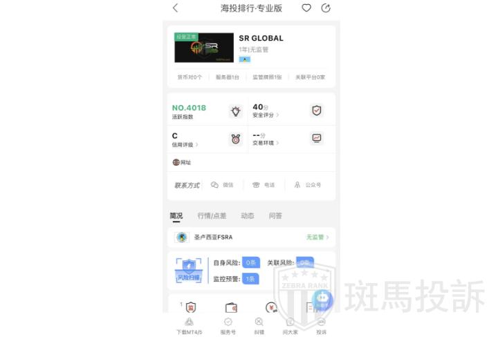 这家叫SR GLOBAL的平台,成立于2024年,全球活跃指数4018名,目前无监管,也没有外汇牌照,不能做外汇保证金交易,风险扫描显示1条风险,投资者资金安全无保障。