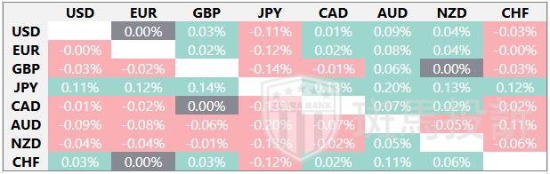 热图显示了主要货币对的波动百分比变化。基准货币从左列中选取,报价货币从顶行中选取。例如,如果投资者从左列选择欧元,然后沿水平线移动到日元,方框中显示的百分比变化即为欧元/日元波动。