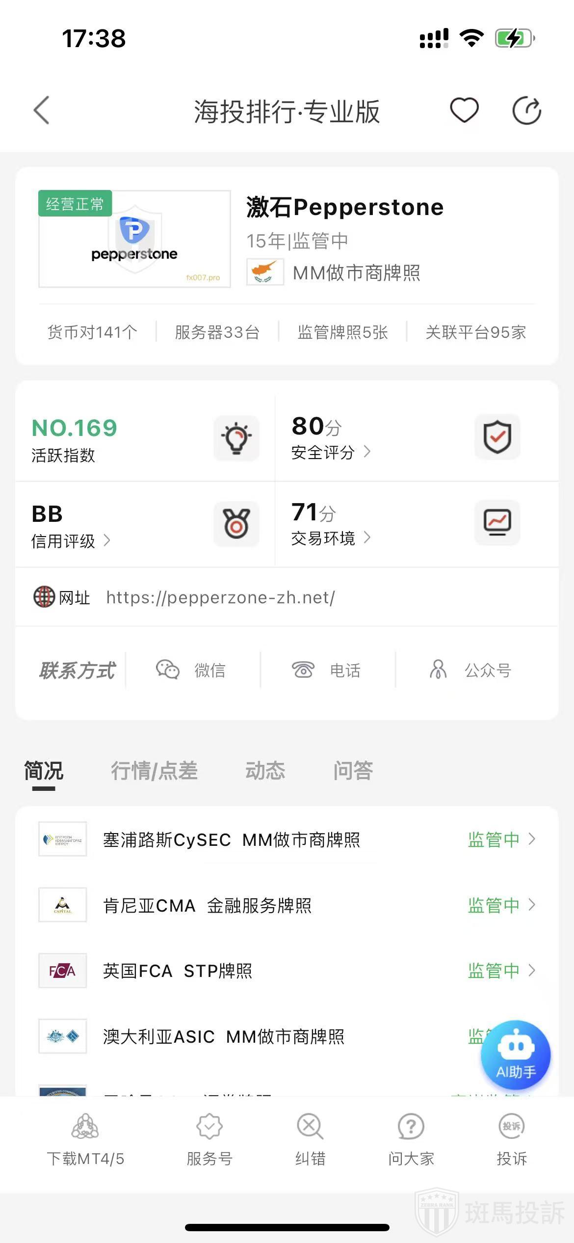海投排行综合点评:激石Pepperstone目前官网属于正常运营中,投诉方面是因为合约报价错误或者入金延迟导致保障等交易环境问题,需要注意下。负面信息较少,各方评论总体还可以,交易品种多,就是投诉方面处理较慢。