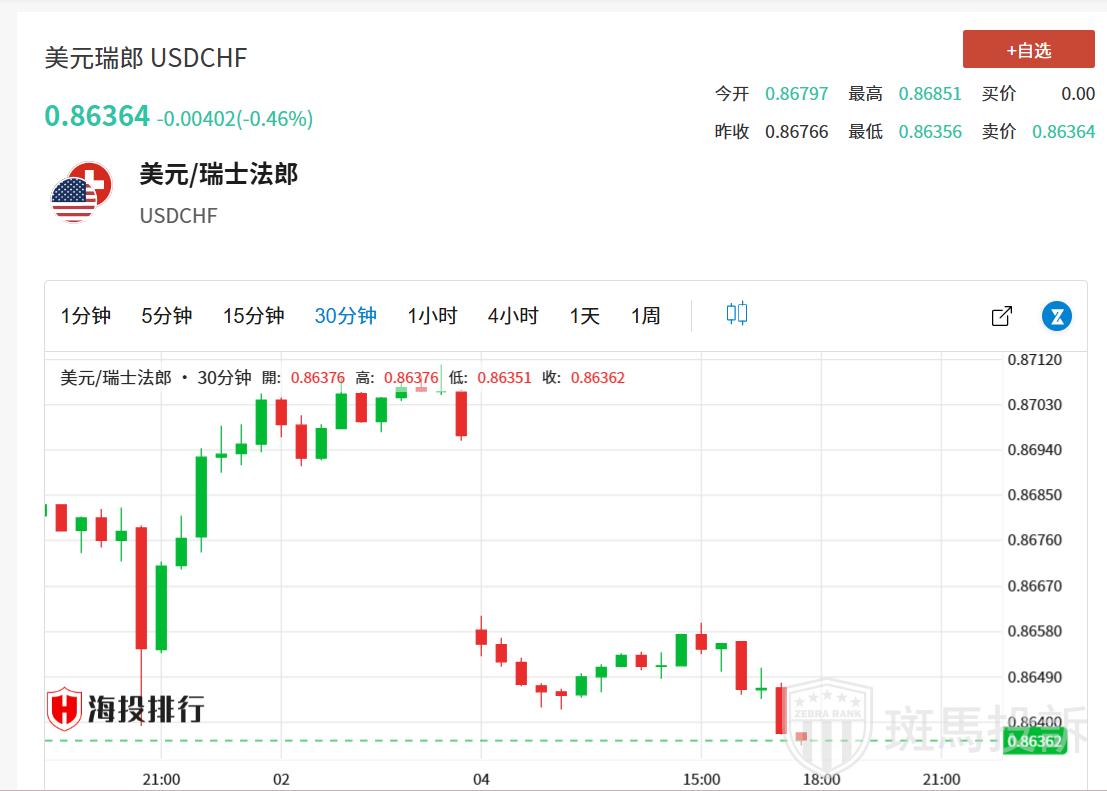 美国国债收益率走低,美元/瑞郎贬值。