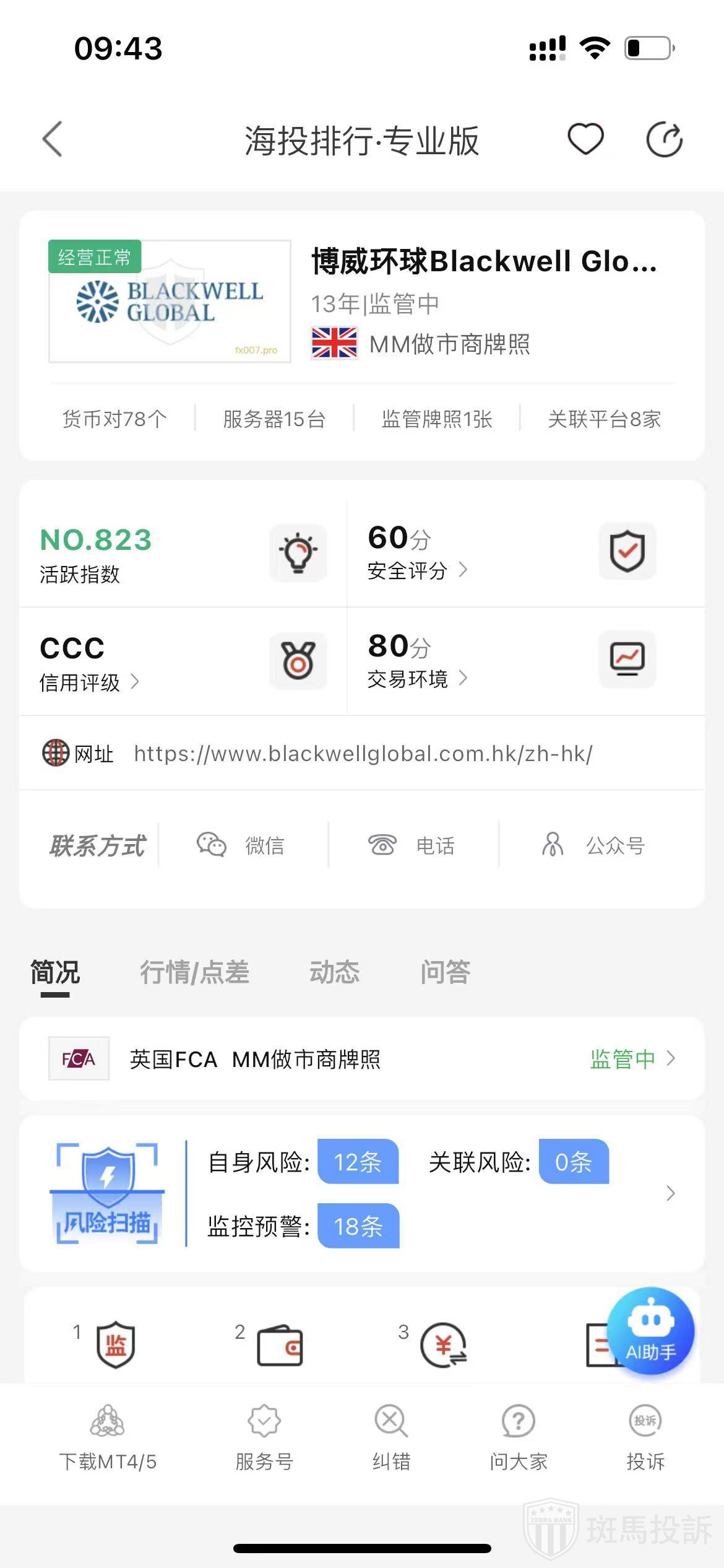 根据海投排行查询显示,这家平台叫博威环球Blackwell Global,成立于2012年,全球排名823名,安全评分60分,平台宣传称拥有1个国家的监管牌照,风险扫描预警有30条.