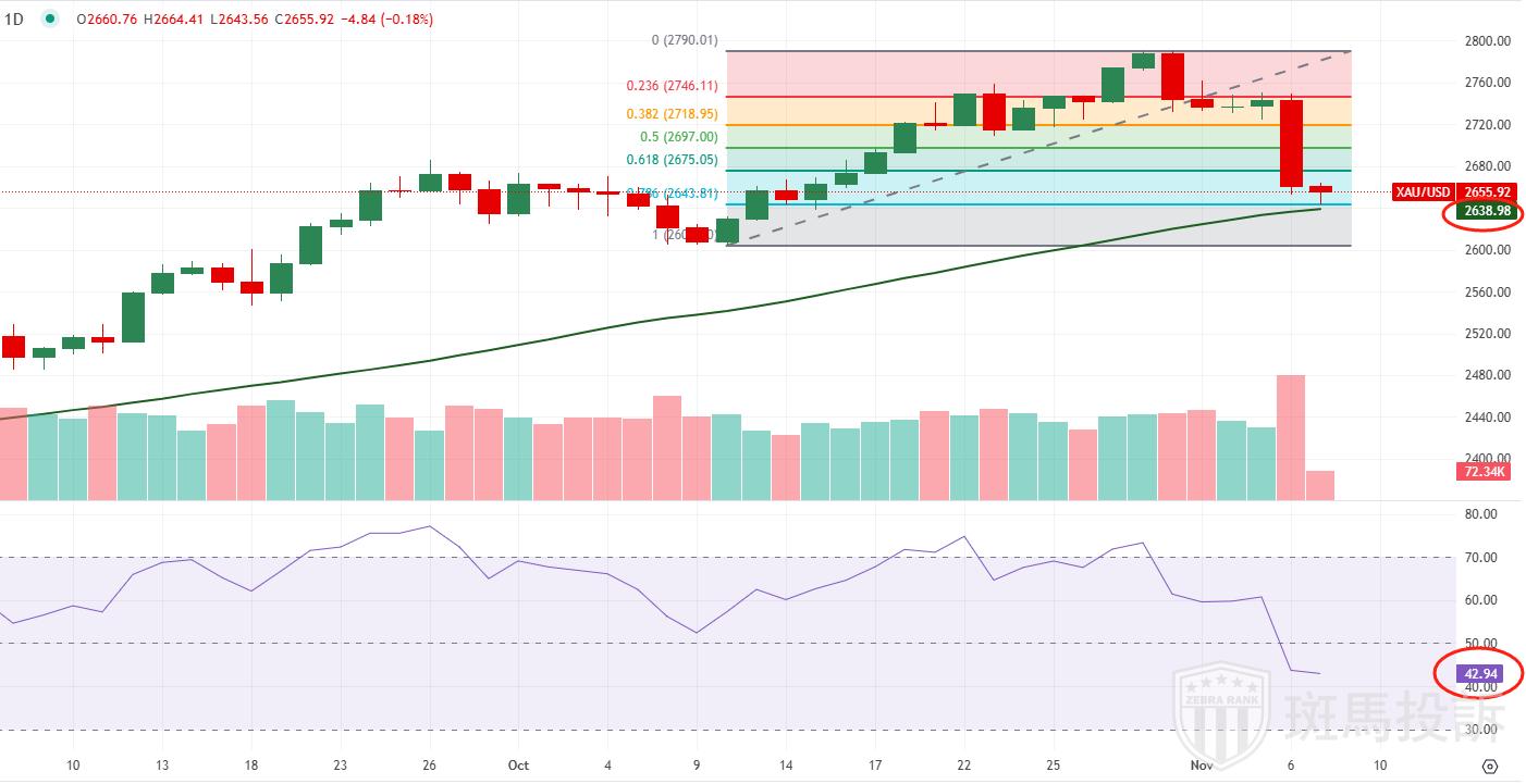从技术角度看,黄金已跌破多个关键支撑位。一些分析师指出,金价已跌破2708.76美元这一关键支撑位,并跌至2697.28美元的枢轴水平之下,使得黄金趋势向下。接下来的交易日,金价可能在2638.54美元附近的50日均线面临严峻考验,这是当前黄金的一个重要支撑位。如果金价跌破50日均线,可能引发更大幅度的抛售,新的下跌趋势将向10月10日的低点2604美元延伸。