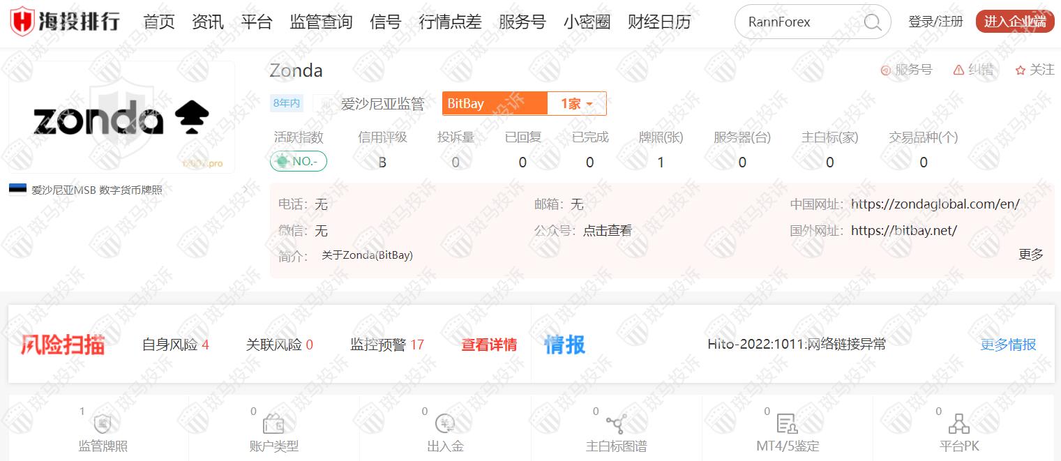 Zonda平台成立于2014年,受爱沙尼亚监管,风险扫描显示17条风险,投资者需注意其风险提示信息。