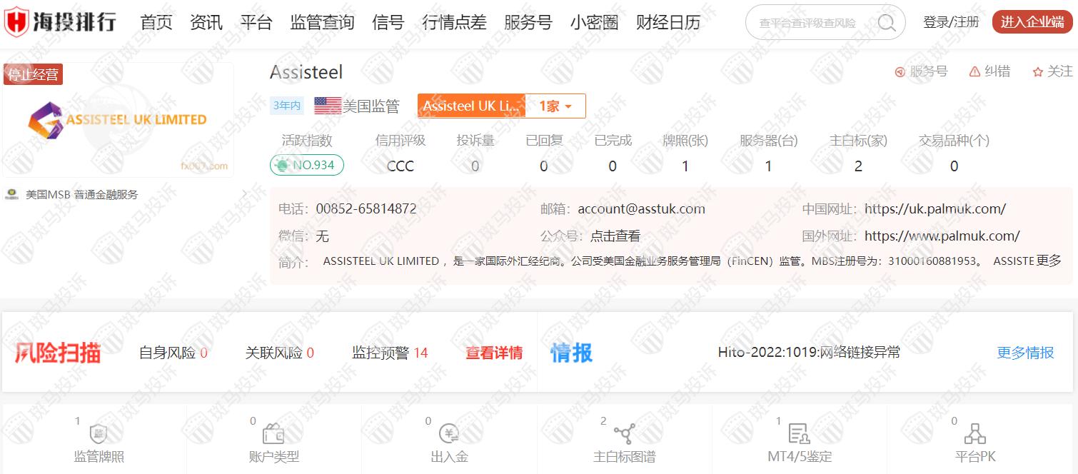 这家平台叫Assisteel,成立于2019年,全球排名935名,目前停止经营,由美国MSB监管,但是没有外汇牌照,不能做外汇保证金交易,风险扫描显示14条风险,投资者资金安全无保障。